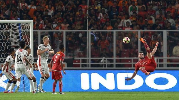 Marko Simic mencetak gol akrobatik, yang merupakan gol kedua Persija dalam laga final Piala Presiden 2018. (ANTARA FOTO/Wahyu Putro A) |