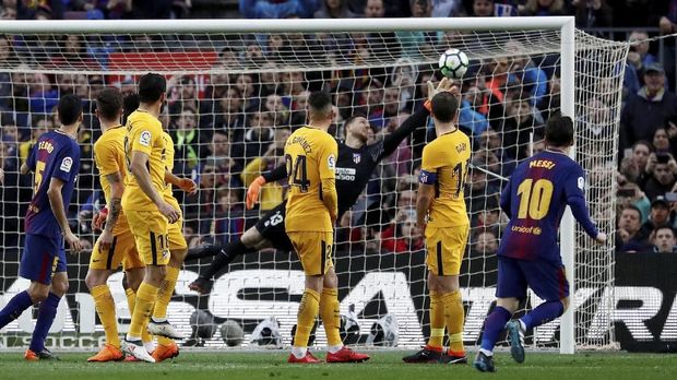 Kiper Atletico Madrid Jan Oblak tak mampu menepis tendangan bebas Lionel Messi. (REUTERS/Juan Medina) |