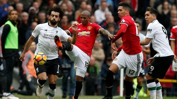 Ashley Young terus mengikuti pergerakan Mohamed Salah sepanjang pertandingan. (Foto: REUTERS/Andrew Yates)