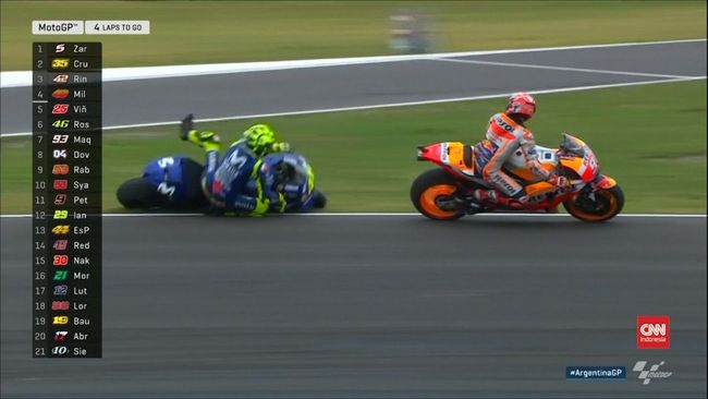 Jakarta, CNN Indonesia -- Balapan MotoGP Argentina yang berlangsung pada Minggu (8/4) di Termas de Rio Hondo penuh drama dan aksi yang menegangkan, mulai dari awal start hingga kemelut Marc Marquez menabrak Valentino Rossi.The Doctor terjatuh di tikungan ke-13 pada sisa empat lap terakhir karena ditabrak Marquez dari sisi dalam tikungan.