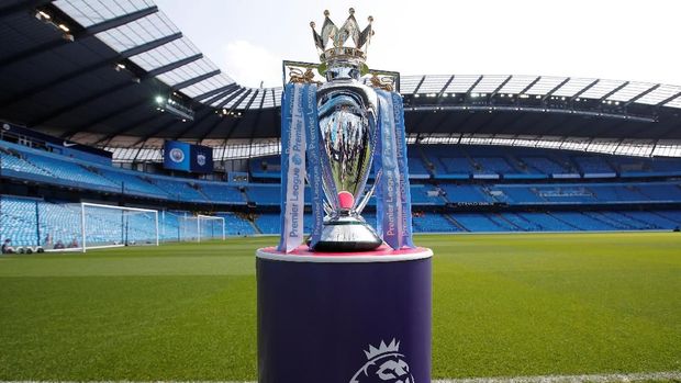 Trofi Liga Primer Inggris dipamerkan Manchester City di markas mereka, Stadion Etihad, sebelum laga melawan Huddersfield Town. (Reuters/Carl Recine)
