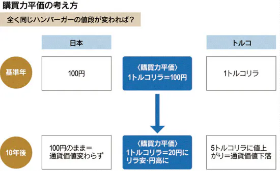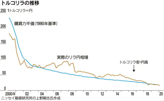 岡根 為替レートが長期的には2つの通貨のモノを買う力(購買力)を反映して動くという考え方を購買力平価っていう。グラフはトルコリラを対象に購買力平価で計算した理論価格と、実際の為替レートを示している。インフレ率の高い国は購買力平価が示す理論値が通貨安の方向に進むんだ。