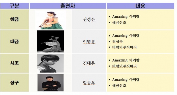 또 △예로부터 이것을 불면 적병이 물러가고 질병이 낫는 등 근심이 사라져 ‘만파식적’이라고 불리는 ‘대금’으로 연주하는 ‘청성곡’ △관악기의 음색과 현악기의 음색을 고루 포용해 어느 쪽에도 치우치지 않는 중용의 매력을 가진 ‘해금’으로 연주하는 ‘해금산조’ △자신을 늙고 병들게 하는 세월을 바람에 빗대어 더 이상 어려움이 찾아오지 않았으면 하는 선비의 마음을 전통음악으로 표현한 ‘바람아 부지 마라’ 등을 통해 희망을 전달한다.